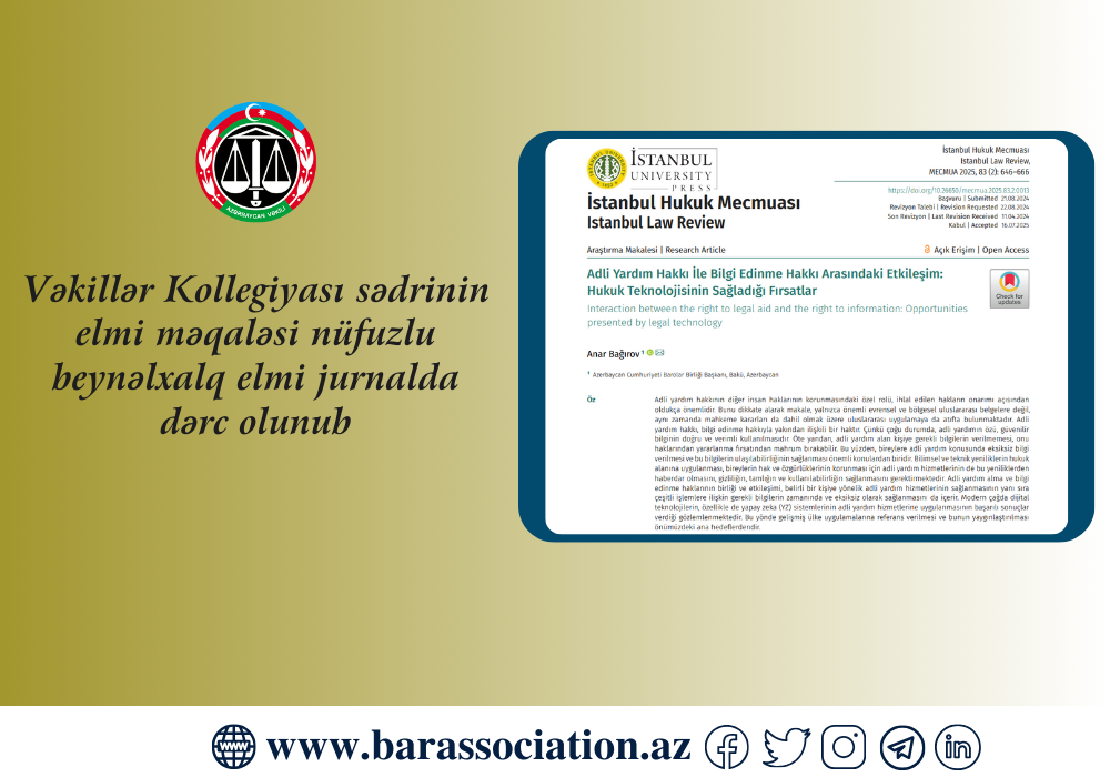 Azərbaycan Respublikasının Vəkillər Kollegiyasının sədri hüquq üzrə fəlsəfə doktoru Anar Bağırovun İstanbul Universiteti Hüquq fakültəsi tərəfindən nəşr olunan “İstanbul Hukuk Mecmuası” elmi jurnalının 2025, №2 sayının, 83-cü cildində “Adli yardım hakkı ile bilgi edinme hakkı arasındaki etkileşim: Hukuk teknolojisinin sağladığı fırsatlar” (“İnteraction between the rights to legal aid and the right to information: Opportunites presented by legal technology”) (https://iupress.istanbul.edu.tr/tr/journal/mecmua/article/adli-yardim-hakki-ile-bilgi-edinme-hakki-arasindaki-etkilesim-hukuk-teknolojisinin-sagladigi-firsatlar) adlı məqaləsi dərc olunub.
