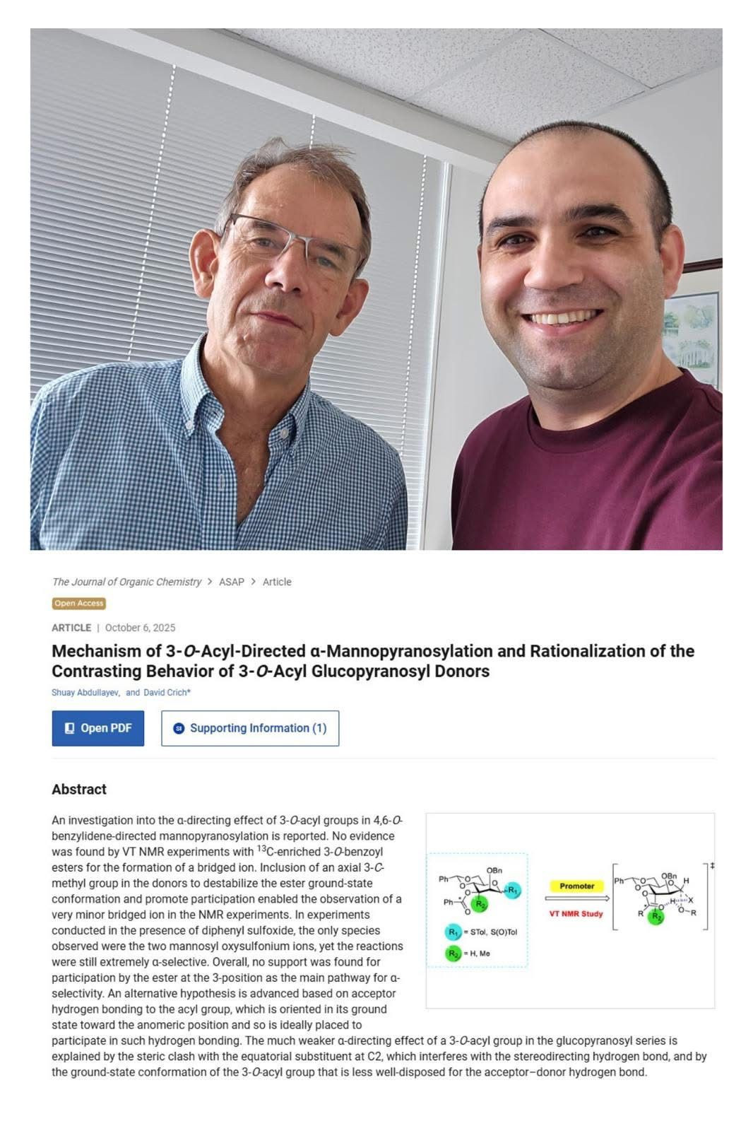 Manset.az xəbər verir ki, ABŞ-ın Corciya Universitetinin Kompleks Karbohidrat Araşdırmaları Mərkəzi (CCRC) və Farmasevtik və Biotibbi Elmlər Departamentinin (PBS) tədqiqatçısı, azərbaycanlı alim Dr. Şuay Abdullayevin də daxil olduğu beynəlxalq elmi qrupun məqaləsi nüfuzlu “Journal of Organic Chemistry (JOC)” jurnalında dərc olunub.
