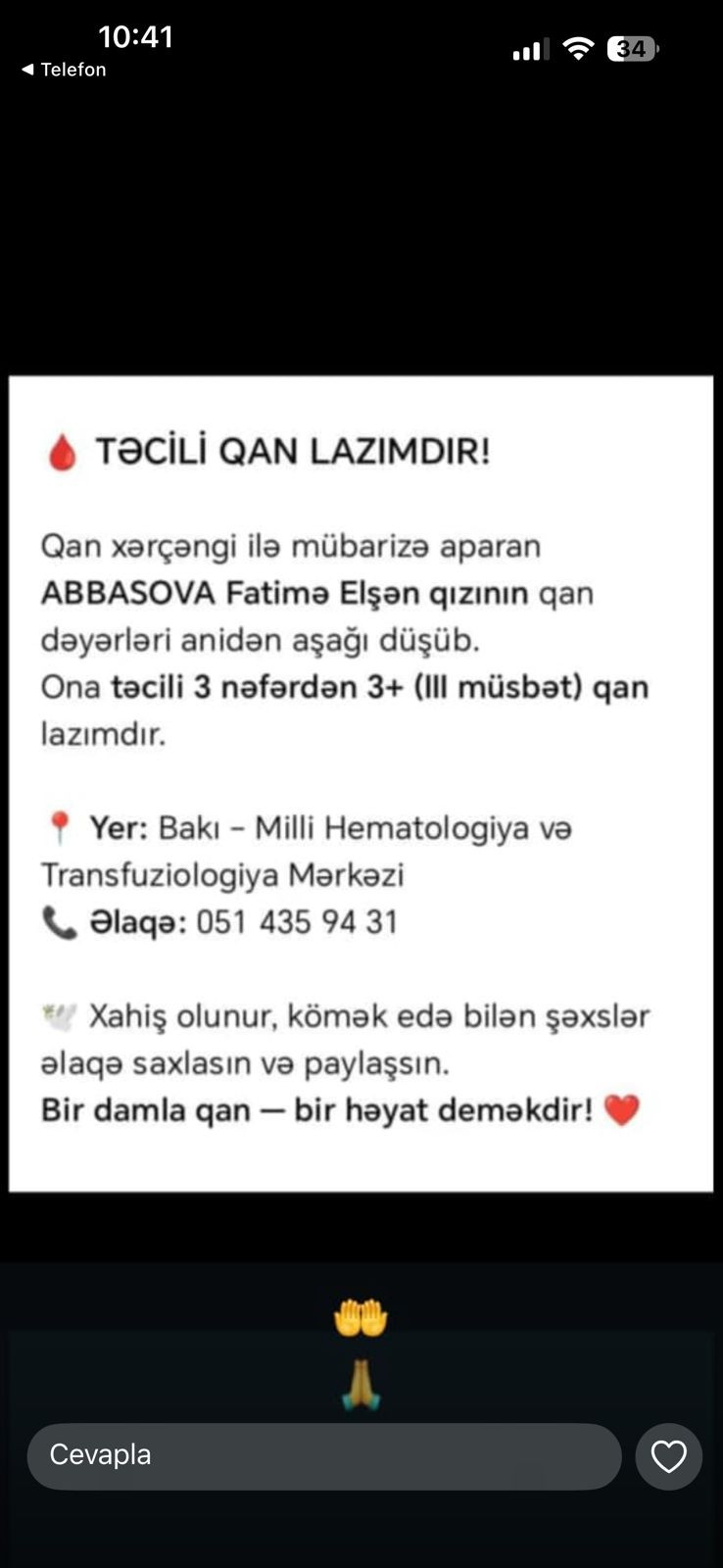 Fatimənin qan dəyərlərinin anidən aşağı düşməsi səbəbindən hazırda ona təcili 3 nəfərdən III müsbət (3+) qan lazımdır. Qan vermək istəyənlərdən Milli Hematologiya və Transfuziologiya Mərkəzinə müraciət etmələri xahiş olunur. (051 435 94 31)