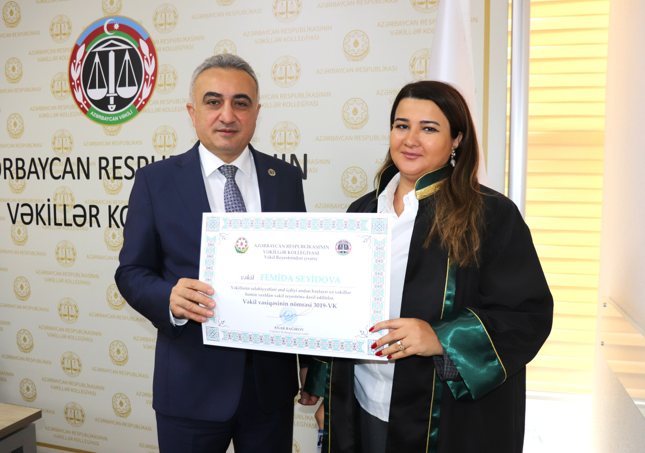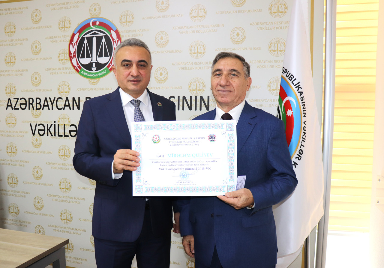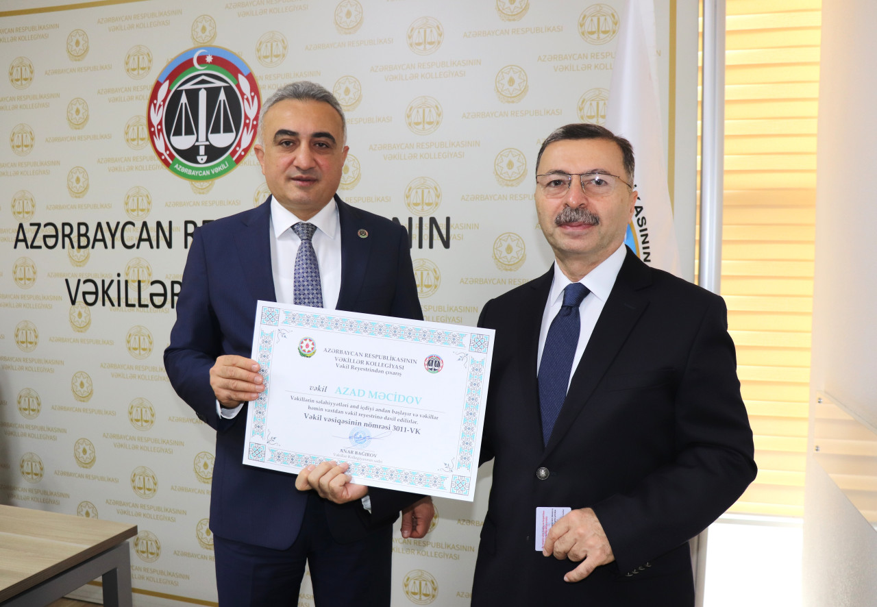 Sonra iclasın gündəliyinə uyğun olaraq vəkilliyə qəbulla bağlı məsələyə də baxılıb. Belə ki, ixtisas imtahanlarının yazılı və şifahi mərhələlərini, eləcə də icbari təlim proqramını uğurla başa vuran namizədlər, habelə əvvəllər hakim və ya vəkil işləmiş vəkilliyə qəbulla bağlı ixtisas imtahanının şifahi müsahibə mərhələsində müvəffəqiyyət qazanmış şəxslərin andiçmə mərasimi keçirilib. Namizədlər vəkil etikası və peşə borcuna sadiq qalacaqlarına dair and içərək Kollegiyanın sıralarına qəbul olunublar. Onlara vəsiqə təqdim edilib və gələcək fəaliyyətində uğurlar arzulanıb.