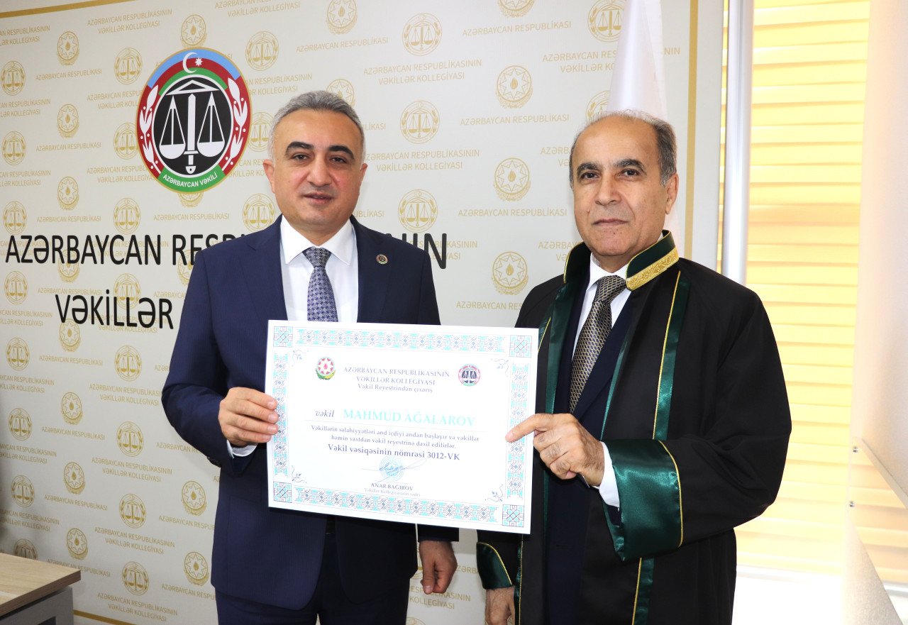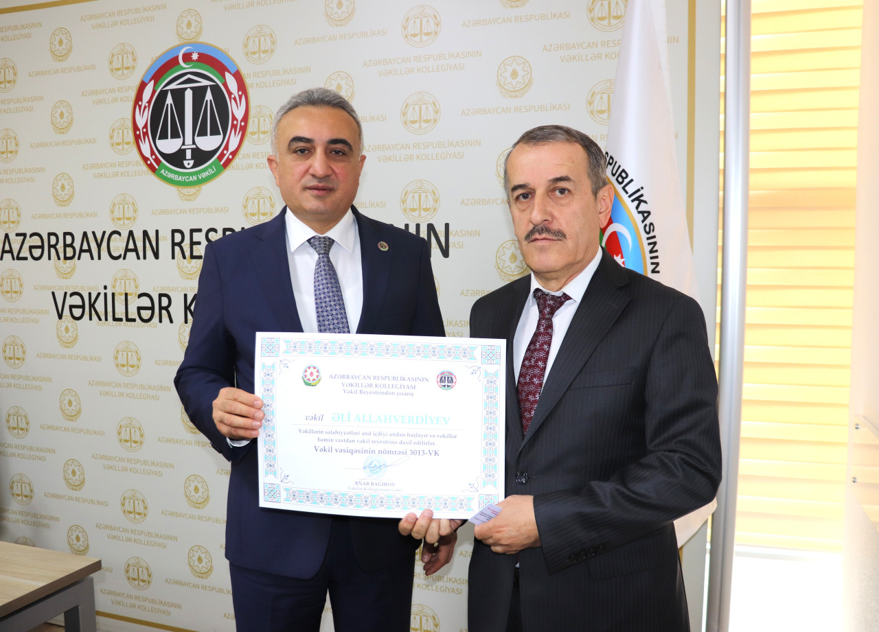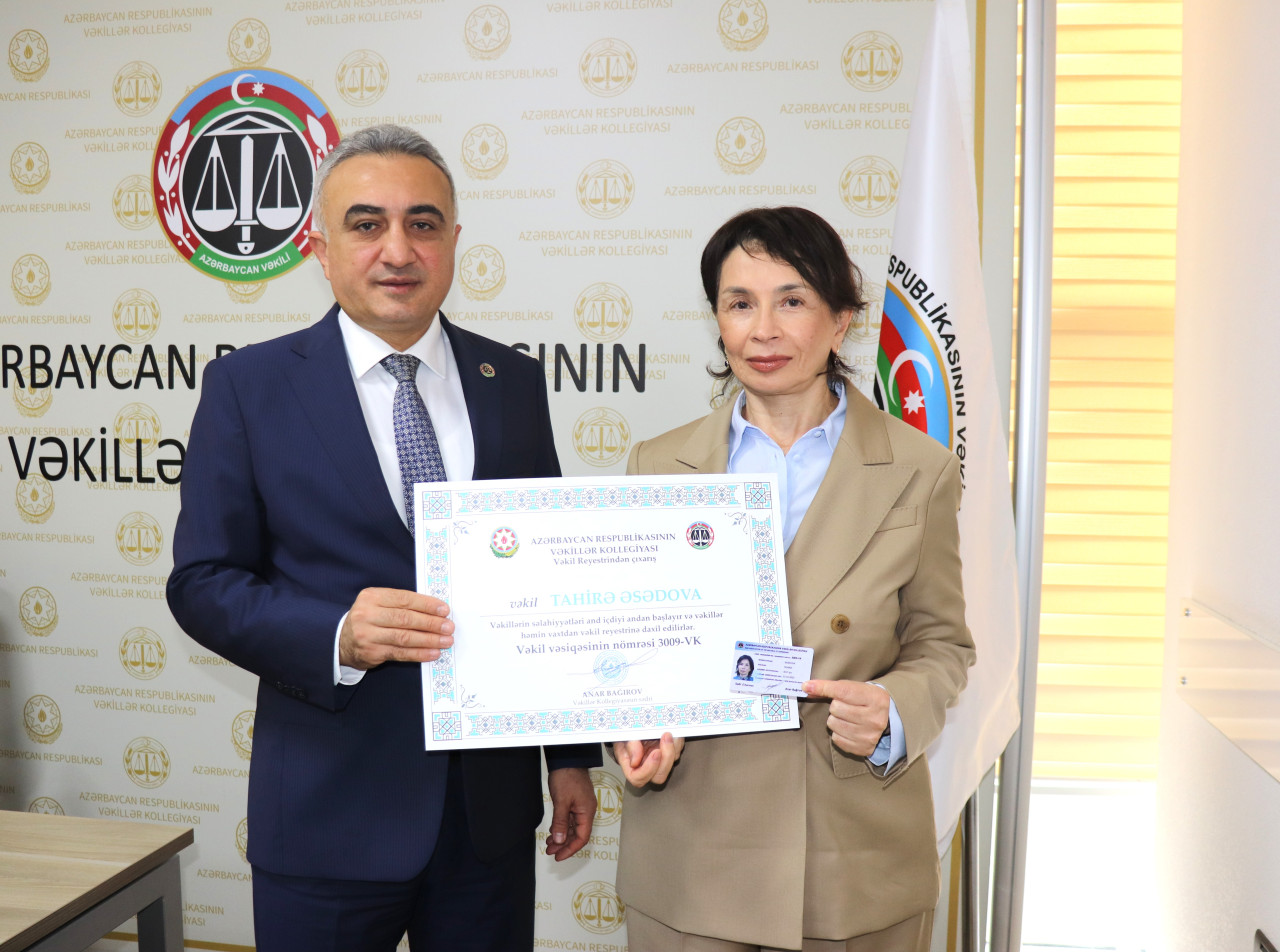 Sonra iclasın gündəliyinə uyğun olaraq vəkilliyə qəbulla bağlı məsələyə də baxılıb. Belə ki, ixtisas imtahanlarının yazılı və şifahi mərhələlərini, eləcə də icbari təlim proqramını uğurla başa vuran namizədlər, habelə əvvəllər hakim və ya vəkil işləmiş vəkilliyə qəbulla bağlı ixtisas imtahanının şifahi müsahibə mərhələsində müvəffəqiyyət qazanmış şəxslərin andiçmə mərasimi keçirilib. Namizədlər vəkil etikası və peşə borcuna sadiq qalacaqlarına dair and içərək Kollegiyanın sıralarına qəbul olunublar. Onlara vəsiqə təqdim edilib və gələcək fəaliyyətində uğurlar arzulanıb.