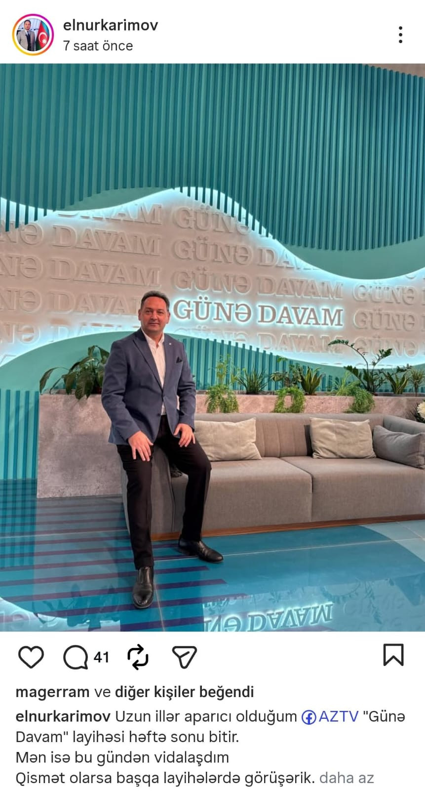 "Uzun illər aparıcı olduğum AzTV-də yayımlanan "Günə Davam" layihəsi həftə sonu bitir. Mən isə bu gündən vidalaşdım Qismət olarsa, başqa layihələrdə görüşərik", - deyə, o bildirib.