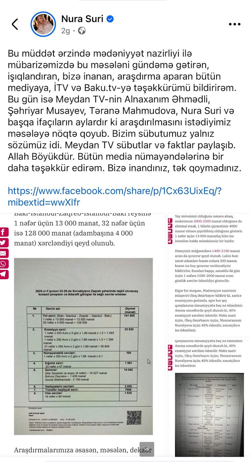 Günlərdir Mədəniyyət Nazirliyini ittiham etmək üçün qondarma “arqumentlər” uyduran, süni intelektin imkanlarından hərtərəfli istifadə etməklə özünü ağıllı göstərən Nura Suri “Meydan TV”-yə təşəkkür edib. Ki, “Meydan TV” də onların (Mədəniyyət Nazirliyinə qarşı qarayaxma kampaniyasında iştirak edənlərin) iddiaları ilə bağlı “araşdırma” aparıb.
