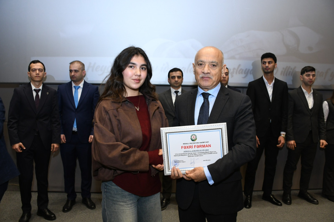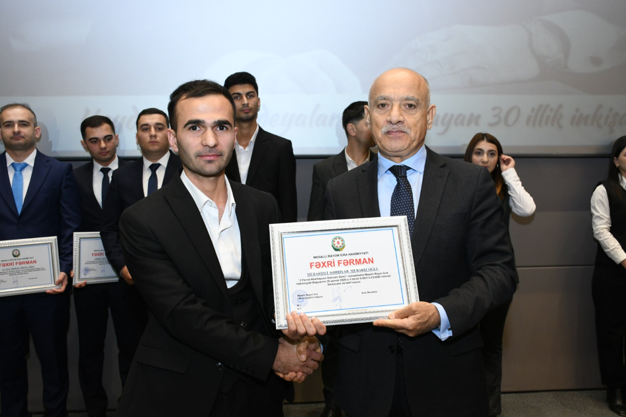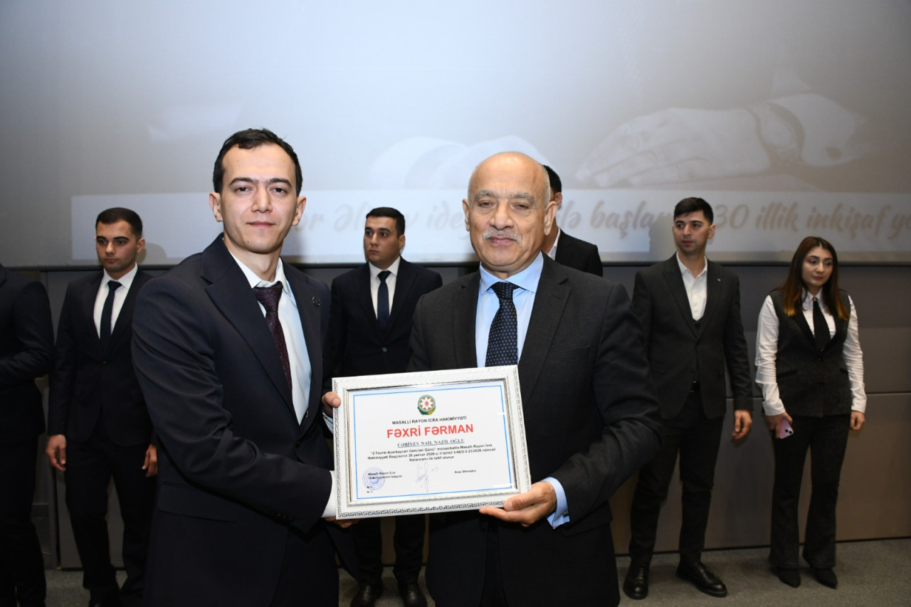 Sonda Masallı rayonunun ictimai-siyasi həyatında fəal iştirakı və təhsil, mədəniyyət, səhiyyə sahəsindəki xidmətlərinə görə İcra Hakimiyyəti Başçısının müaviq Sərəncamı ilə təltif olunmuş bir qrup fəal gəncə rayon rəhbəri Araz Əhmədov tərəfindən Fəxri Fərman, həmçinin  Lənkəran-Astara Regional Gənclər və İdman İdarəsinin rəis müavini Könül Manafova tərəfindən Fəxri Fərman təqdim edilmiş, xatirə şəkilləri çəkilmişdir.