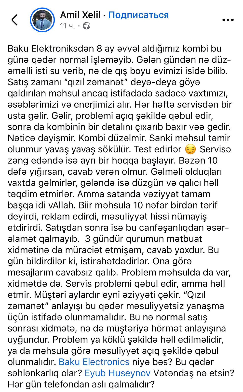 Manset.az xəbər verir ki, onun sözlərinə görə, 8 ay əvvəl alınan kombi bu günədək normal fəaliyyət göstərmir. Bildirilib ki, cihaz nə stabil isti su təmin edib, nə də qış mövsümündə mənzilin lazımi səviyyədə isinməsinə imkan verib. Satış zamanı “qızıl zəmanət” adı altında təqdim olunan məhsulun istifadədə ciddi problemlər yaratdığı qeyd olunur.