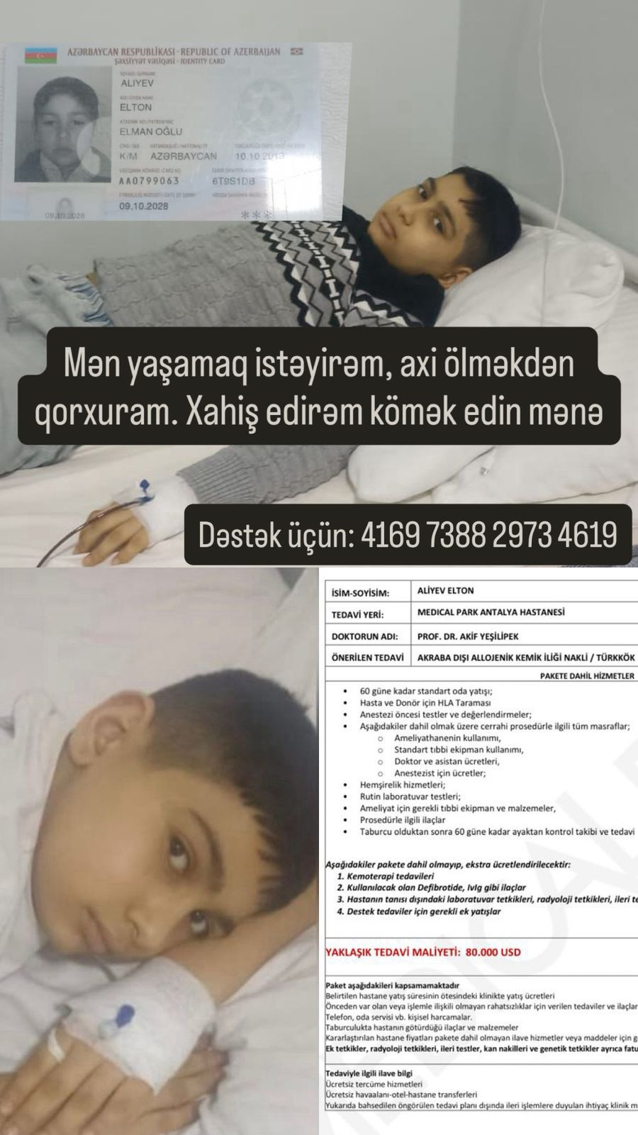 Hazırda Eltonun həyatını xilas etmək üçün Türkiyədə təcili əməliyyata ehtiyac var. Müalicə və əməliyyat xərcləri üçün ümumilikdə 80 min dollar tələb olunur.