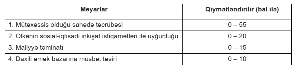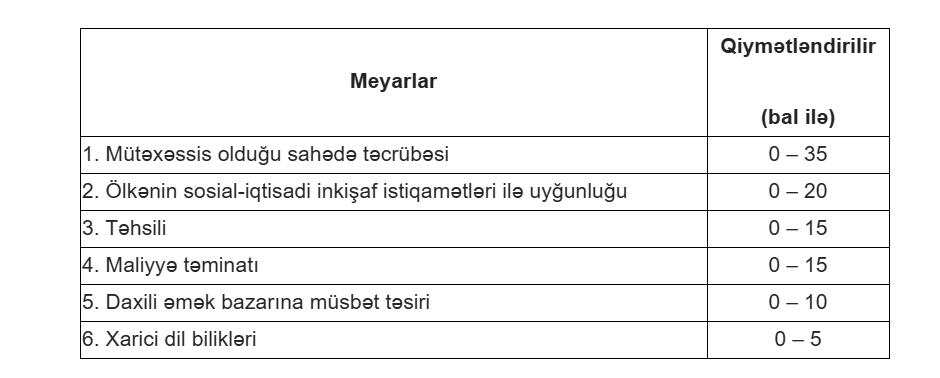 Qeyd edək ki, verilmiş balların cəmi azı 70 (yetmiş) bal olduqda əcnəbi yüksək ixtisaslı miqrant hesab olunması üçün nəzərdə tutulan keçid balını toplamış hesab olunur.