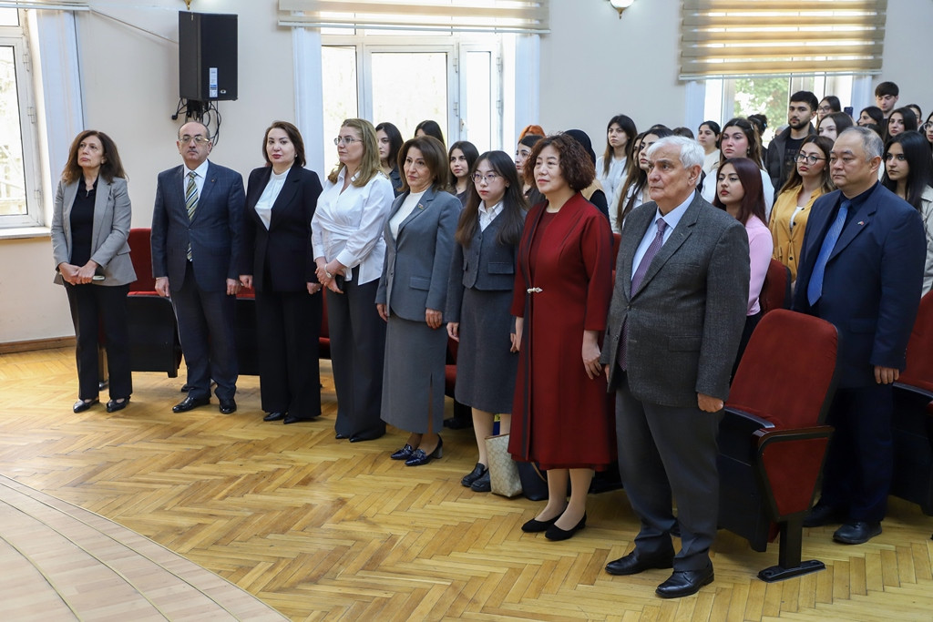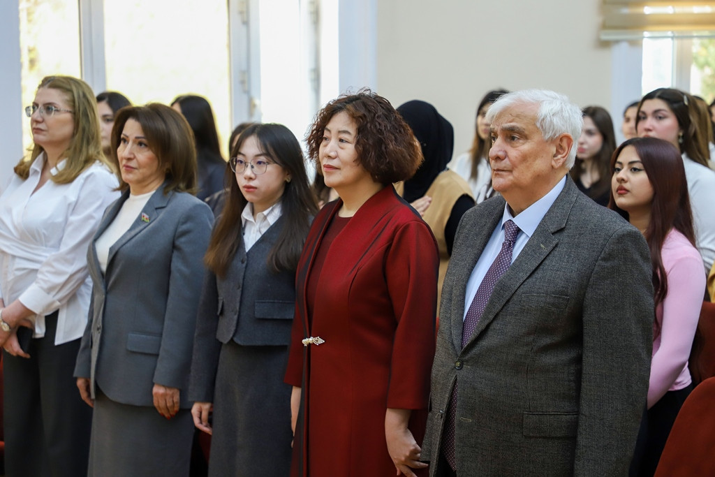 ADU-nun rektoru, akademik Kamal Abdulla tədbir iştirakçılarını salamlayaraq Çin Xalq Respublikasının Azərbaycandakı səfiri xanım Lu Mey və digər çinli qonaqları universitetdə keçirilən bayram tədbirində görməkdən məmnun olduğunu bildirib. Beynəlxalq Çin Dili Gününün qeyd edilməsinin əhəmiyyətindən danışan rektor bildirib ki, beş min il əvvəl yaranan Çin heroqrifləri dünya mədəniyyətinin inkişafında çox mühüm rol oynayıb. Böyük İpək Yolu təkcə ticarət deyil, həm də böyük mənəviyyat yolu idi.