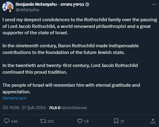 İsrailin Baş naziri Binyamin Netanyahu ötən gün dünyasını dəyişən yəhudi əsilli Rotşildlər ailəsinin 4 nəsil lideri, 87 yaşlı Ceykob Rotşild üçün başsağlığı mesajı paylaşıb.