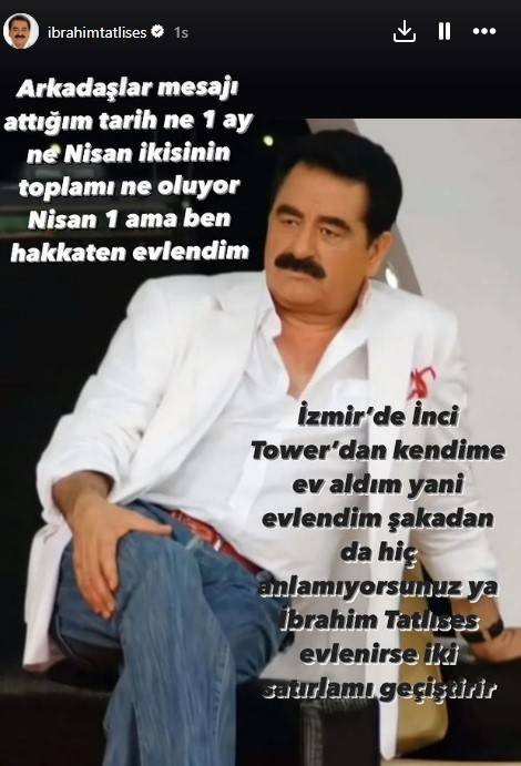 “Dostlar, mesajı göndərdiyim tarix nə 1, ay nə aprel... İkisinin cəmi nə olur? 1 aprel. Amma mən həqiqətən evləndim. İzmirdə özümə ev aldım. Yəni evləndim. Heç zarafat başa düşmürsünüz. İbrahim Tatlısəs evlənsə iki sətirlə yola verər?