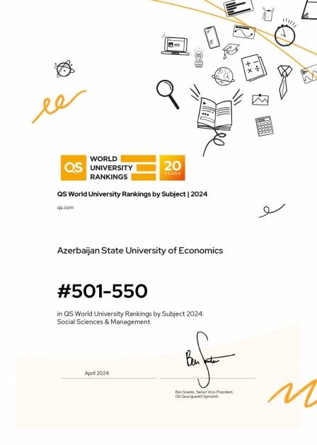 Aprelin 10-da QS Reytinq Agentliyinin sahələr üzrə açıqladığı dünya reytinqinə (QS World University Rankings by Subject | 2024) əsasən, Azərbaycan Dövlət İqtisad Universiteti (UNEC) "İqtisadiyyat, Ekonometrika" üzrə keçənilki reytinqlə müqayisədə 150 pillə irəliləyərək, dünyanın ən yaxşı 351-400-cü universiteti səviyyəsinə yüksəlib.