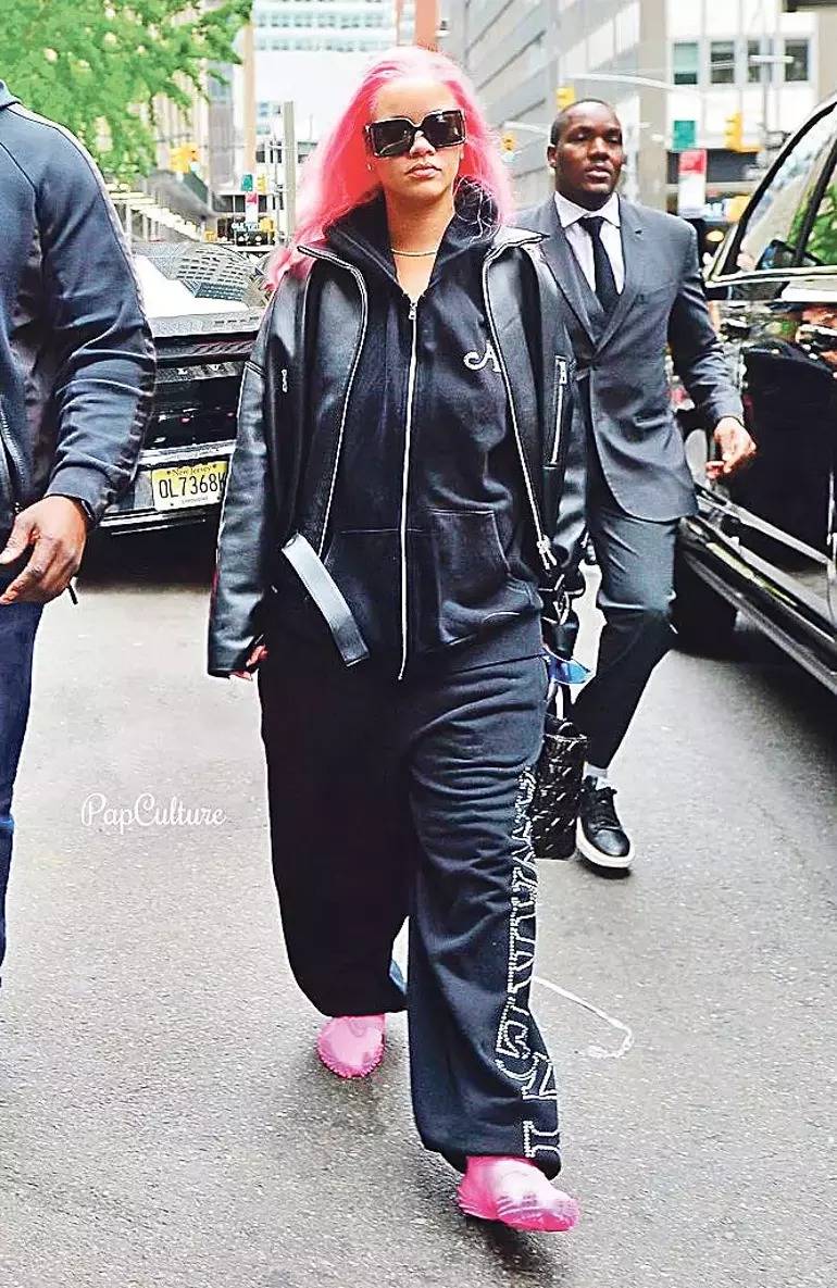 Rihanna saçlarını brendin yeni kolleksiyasından olan çəhrayı ayaqqabılarla uyğunlaşdırıb.