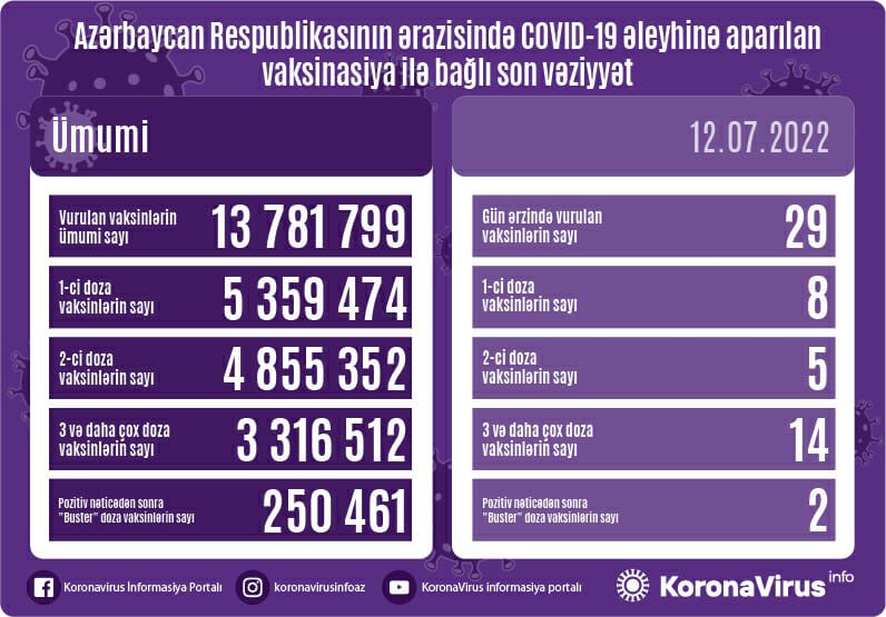 Bildirilib ki, bir gündə birinci mərhələ üzrə vaksinasiya olunanların sayı 8, ikinci mərhələ üzrə vaksinasiya olunanların sayı 5, üç və daha çox doza üzrə vaksinasiya olunanların sayı 14, pozitiv nəticədən sonra buster doza üzrə vaksinasiya olunanların sayı 2 nəfərdir.