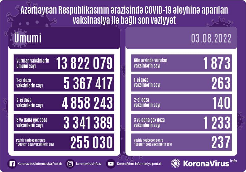 Ölkədə üç və daha çox doza vaksinlərin sayına gəlincə, bu göstərici 1233-dür. Pozitiv nəticədən sonra “buster” doza vaksinlərin sayı 237 olub.