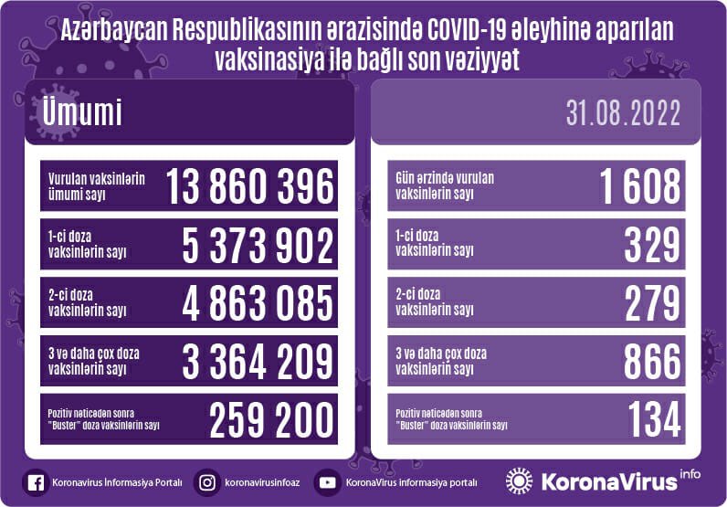 Azərbaycanda son sutkada koronavirus (COVID-19) əleyhinə 1 608 vaksin vurulub.