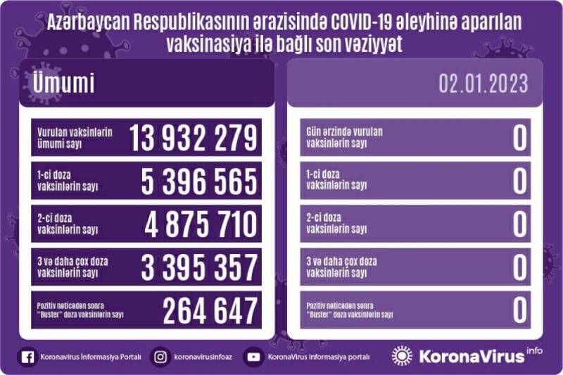 Nazirlər Kabineti yanında Operativ Qərargahdan Manset.az-a verilən məlumata görə, vurulan vaksinlərin ümumi sayı 13 932 279, birinci mərhələ üzrə vaksinasiya olunanların ümumi sayı 5 396 565, ikinci mərhələ üzrə vaksinasiya olunanların sayı 4 875 710, üç və daha çox doza üzrə vaksinasiya olunanların sayı 3 395 357, pozitiv nəticədən sonra buster doza üzrə vaksinasiya olunanların sayı isə 264 647 nəfər təşkil edir.