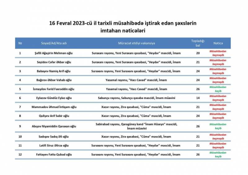 Bildirilib ki, İslam dininə aid ibadət yerlərində (məscidlər) vakant vəzifələrin tutulması üçün 16 fevral 2023-cü ildə keçirilmiş müsahibənin nəticələri açıqlanıb.