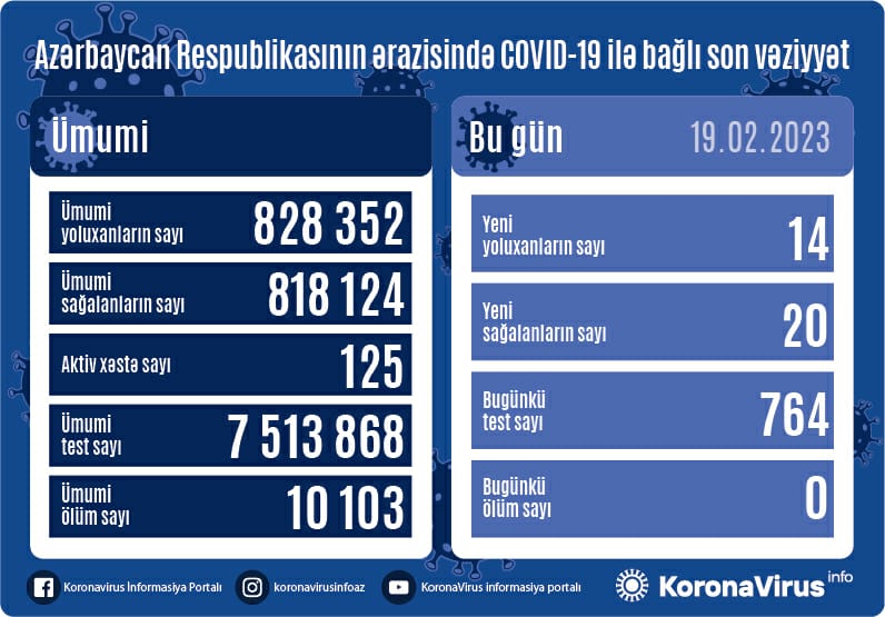 Azərbaycanda son sutkada koronavirus infeksiyasına 14 yeni yoluxma faktı qeydə alınıb, 20 nəfər müalicə olunaraq sağalıb.