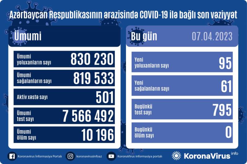 Azərbaycanda indiyədək ümumilikdə 830 230 nəfərin koronavirus infeksiyasına yoluxması faktı müəyyən edilib. Onlardan 819 533 nəfər müalicə olunaraq sağalıb, 10 196 nəfər vəfat edib, aktiv xəstə sayı 501 nəfərdir.