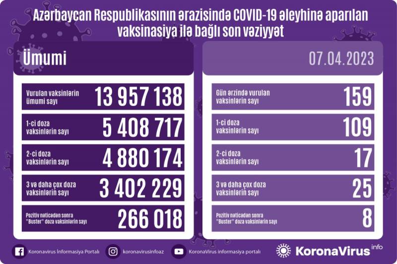 Vurulan vaksinlərin ümumi sayı 13 957 138, birinci mərhələ üzrə vaksinasiya olunanların ümumi sayı 5 408 717, ikinci mərhələ üzrə vaksinasiya olunanların sayı 4 880 174, üç və daha çox doza üzrə vaksinasiya olunanların sayı 3 402 229, pozitiv nəticədən sonra buster doza üzrə vaksinasiya olunanların sayı isə 266 018 nəfər təşkil edir.