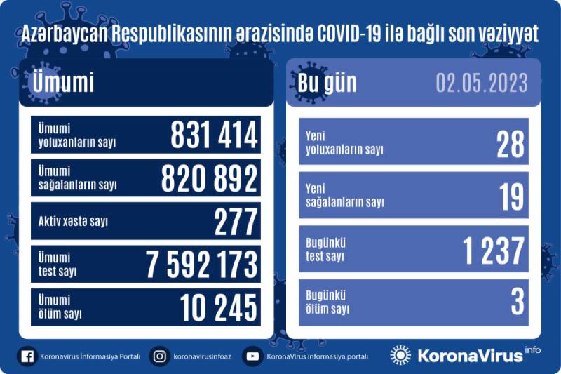 Azərbaycanda koronavirus (COVID-19) infeksiyasına 28 yeni yoluxma faktı qeydə alınıb, 19 nəfər müalicə olunaraq sağalıb.