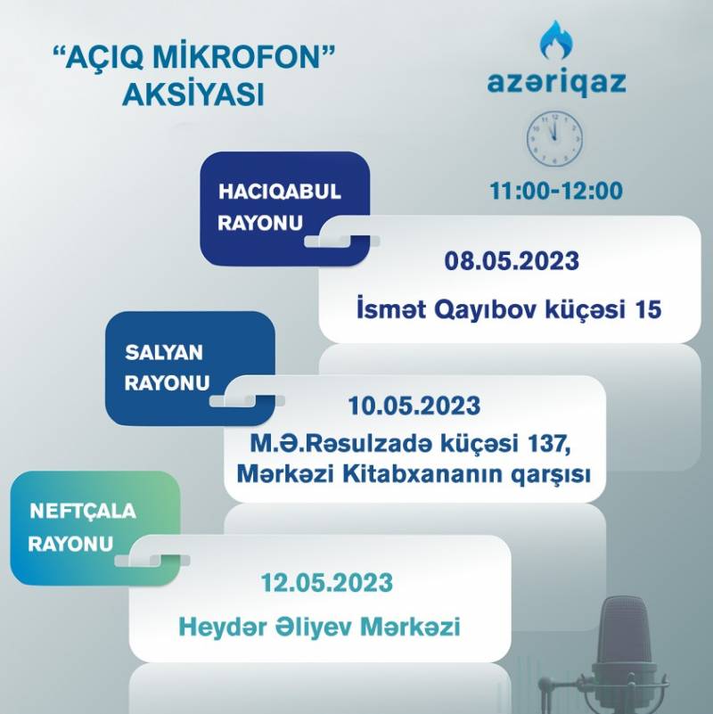 Manset.az xəbər verir ki, növbəti həftə mayın 8-i,10-u və 12-si tarixlərində saat 11:00-dan 12:00-dək daha 3 rayonda vətəndaşlarla “Açıq mikrofon” aksiyası keçiriləcək.