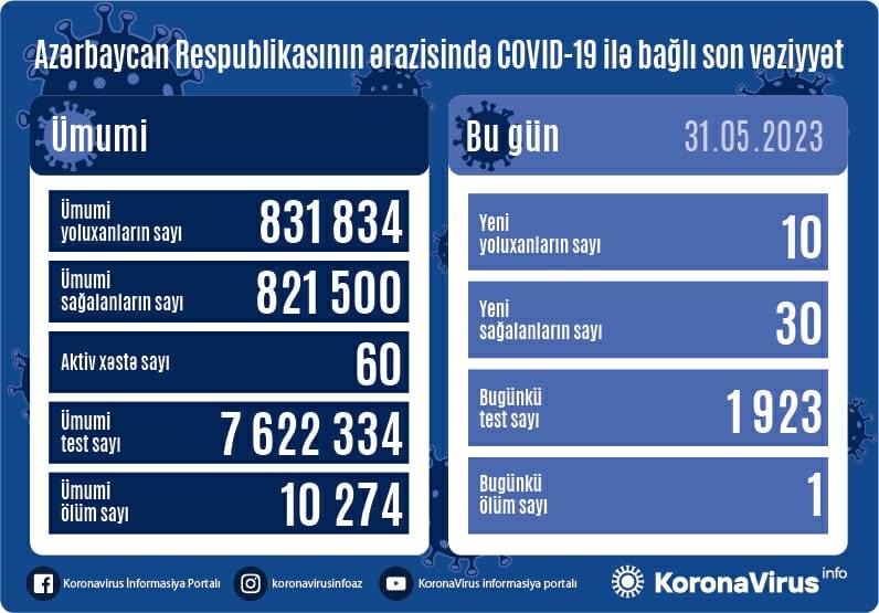 Azərbaycanda koronavirus infeksiyasına 10 yeni yoluxma faktı qeydə alınıb, 30 nəfər müalicə olunaraq sağalıb.