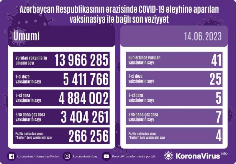 Azərbaycanda bu günə qədər vurulan vaksinlərin ümumi sayı isə 13 966 285 olub.