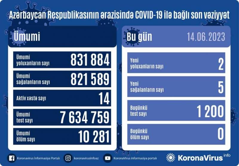 Məlumata görə, son sutka ərzində yeni yoluxma hallarının müəyyənləşdirilməsi ilə əlaqədar 1200, bu günə qədər isə ümumilikdə 7 634 759 test icra olunub.