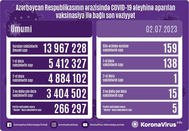 Azərbaycanda son sutkada koronavirus (COVID-19) əleyhinə 159 vaksin vurulub.