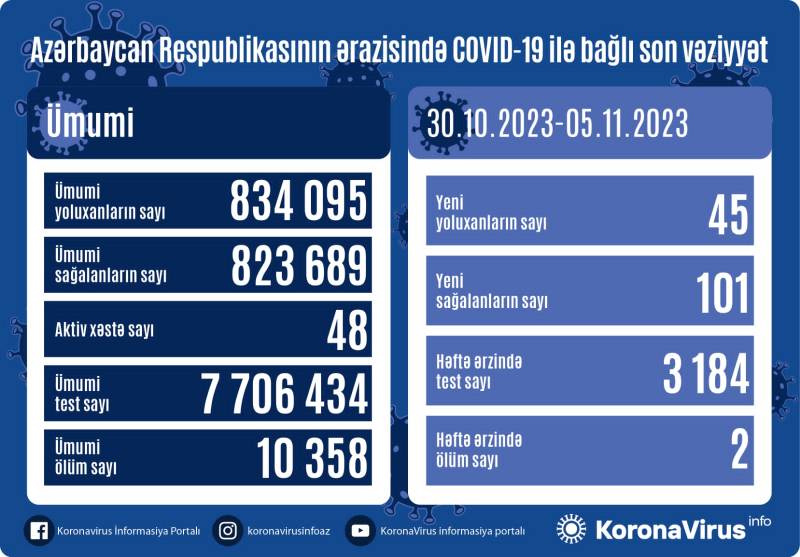 Azərbaycanda son bir həftədə koronavirus infeksiyasına 45 yeni yoluxma faktı qeydə alınıb, 101 nəfər sağalıb.