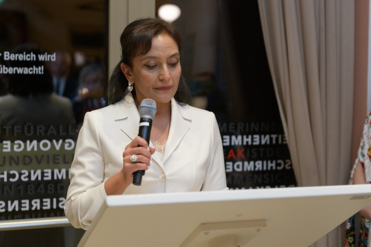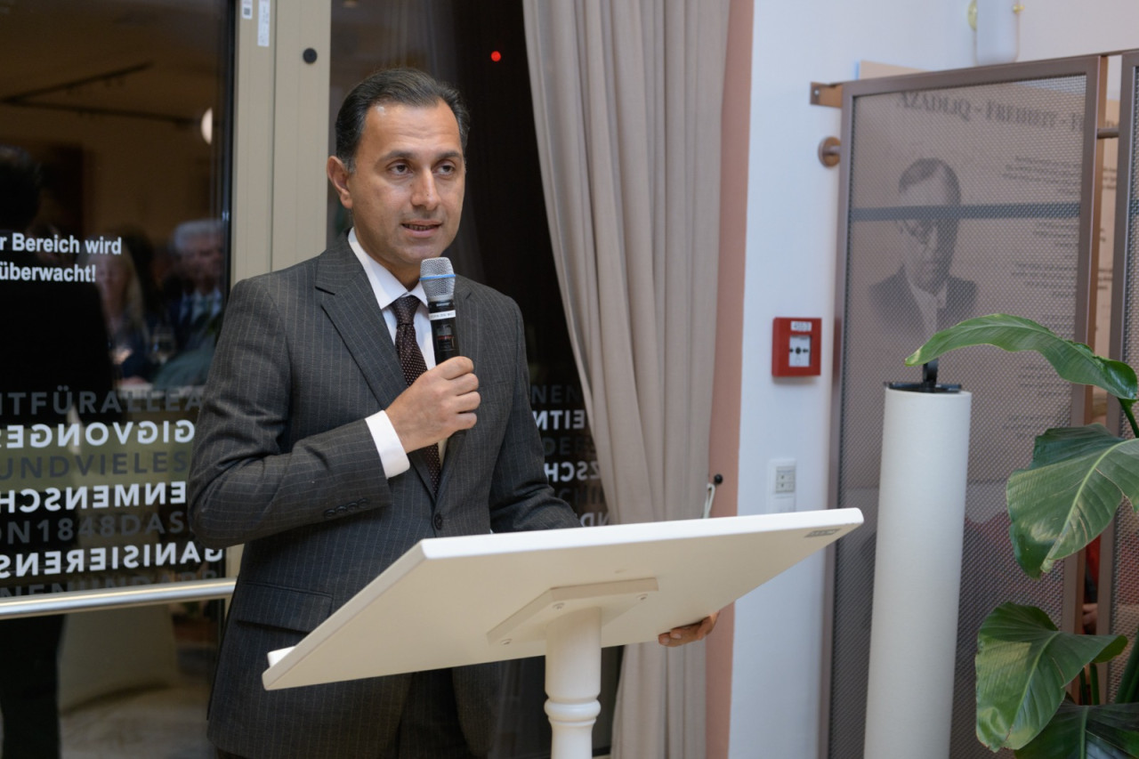 Sonra teatrın foyesində Üzeyir Hacıbəylinin həyat və yaradıcılığına həsr olunmuş fotosərgi açılıb. Vyanadakı Azərbaycan Mədəniyyət Mərkəzinin rəhbəri Leyla Qasımova çıxış edərək Üzeyir Hacıbəylinin Azərbaycan mədəniyyətində tutduğu mövqedən danışıb.