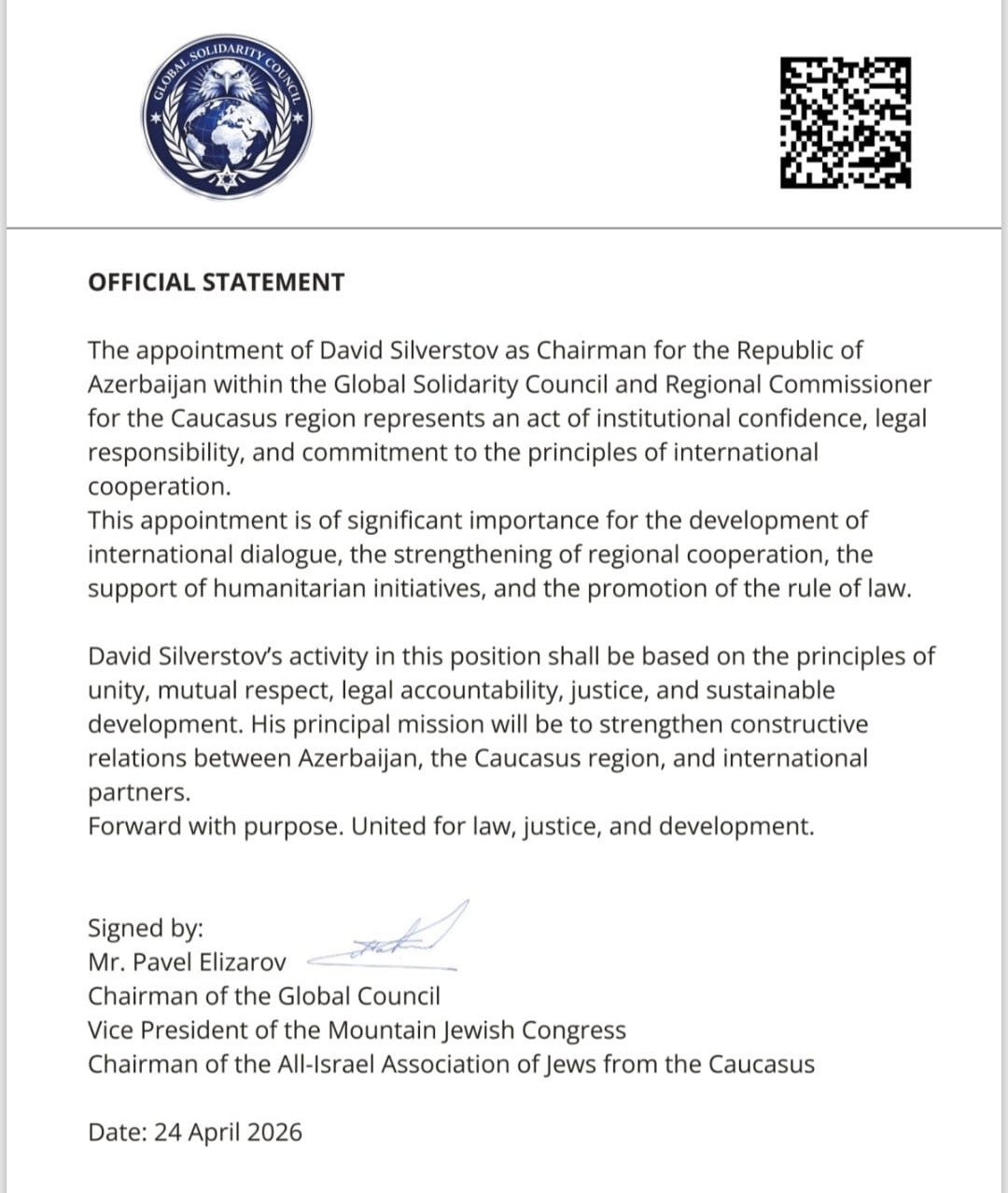 Manset.az-ın əldə etdiyi məlumata görə, Qlobal Həmrəylik Şurasının qərarına əsasən, hüquq müdafiəçisi David Seliverstov Azərbaycan Respublikası üzrə sədr və eyni zamanda Qafqaz regionu üzrə regional komissar vəzifəsinə təyin olunub.