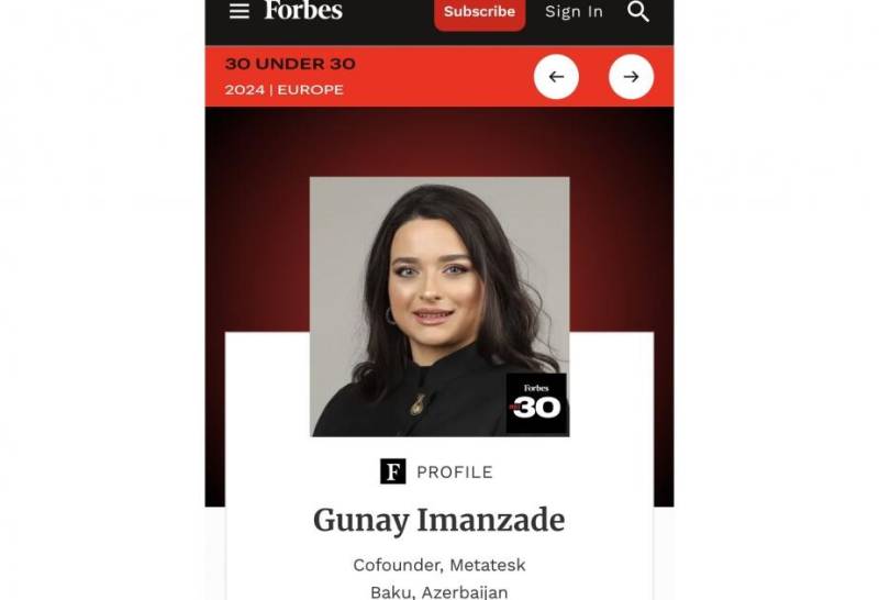 "Forbes” jurnalının dərc etdiyi "30 UNDER 30” siyahısında bu il azərbaycanlı təsisçi Günay İmanzadənin adı qeyd edilib.