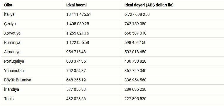 Yanvar-noyabr ayları üzrə ən çox Azərbaycan neftini idxal edən ölkələrin ilk üçlüyündə birinci yerdə İtaliya (13,1 milyon ton, 6,7 milyard dollar) yer alır, ardınca Çexiya (1,4 milyon ton, 742,2 milyon dollar) və Xorvatiya (1,3 milyon ton, 666,6 milyon dollardan çox) gəlir.
