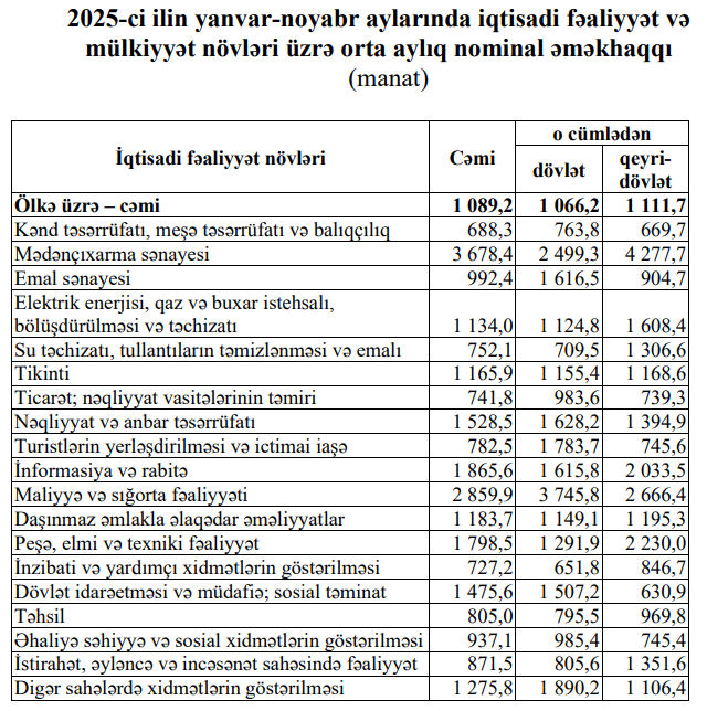 Ən yüksək əməkhaqqı mədənçıxarma sənayesində qeyri-dövlət sektorunda qeydə alınıb - ayda 4 277,7 manat, ən aşağı əməkhaqqı isə qeyri-dövlət sektorunda sosial təminat sahəsində qeydə alınıb - ayda 630,9 manat.