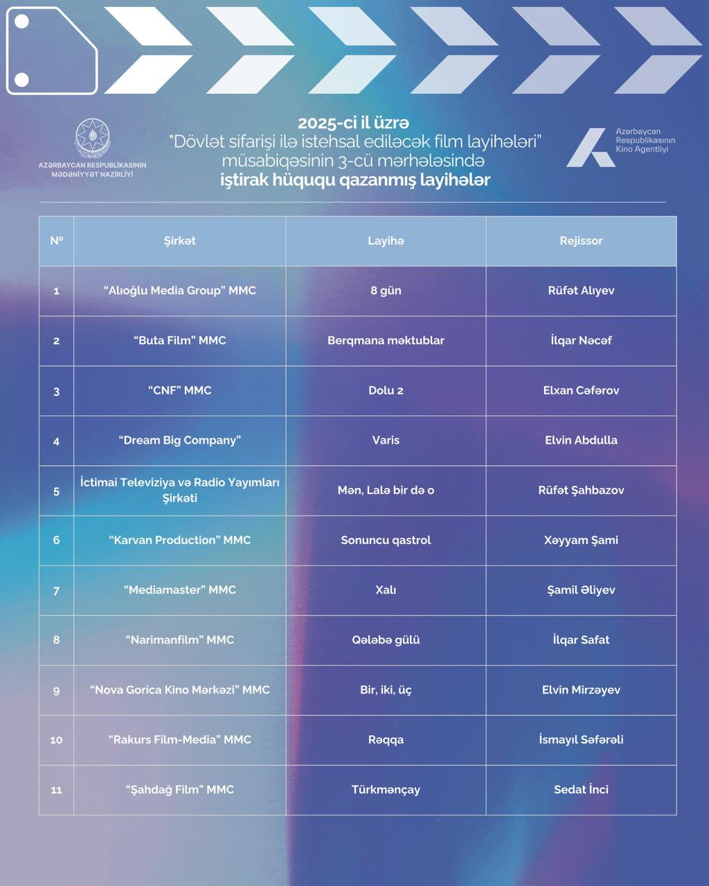 "Qələbə gülü" (“Narimanfilm” MMC), "Bir, iki, üç" (“Nova Gorica Kino Mərkəzi” MMC), "Rəqqa" (“Rakurs Film-Media” MMC) və "Türkmənçay" (“Şahdağ Film” MMC) - ümumilikdə 10 layihə 3-cü mərhələyə keçib.