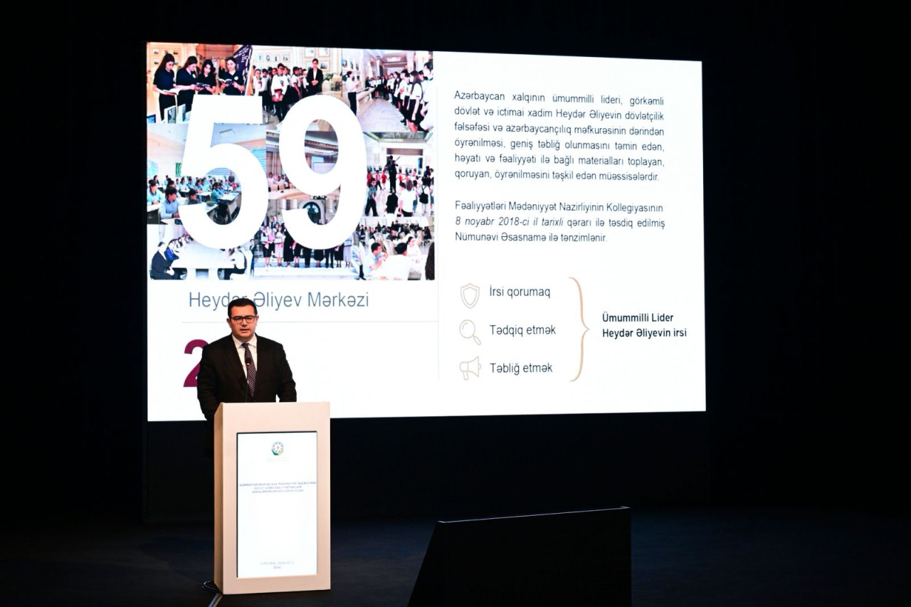 nazirin müşaviri Cəsarət Valehov və Heydər Əliyev mərkəzlərinin fəaliyyəti ilə bağlı Mədəniyyət üzrə Elmi-Metodiki və İxtisasartırma Mərkəzinin direktor müavini Seymur Hüseynov hesabat məruzəsi ilə çıxış ediblər.