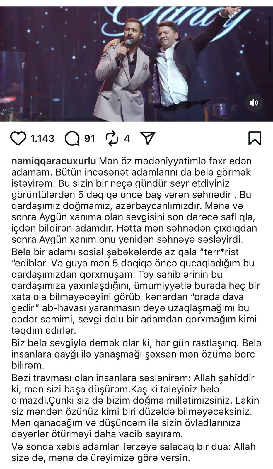 “ Bu qardaşımız doğmamız, azərbaycanlımızdır. Mənə və sonra Aygün xanıma olan sevgisini son dərəcə saflıqla, içdən bildirən adamdır. Hətta mən səhnədən çıxdıqdan sonra Aygün xanım onu yenidən səhnəyə səsləyirdi. Belə bir adamı sosial şəbəkələrdə az qala “terrorist “ediblər. Və guya mən 5 dəqiqə öncə qucaqladığım bu qardaşımızdan qorxmuşam. ” – deyə o qeyd edib.