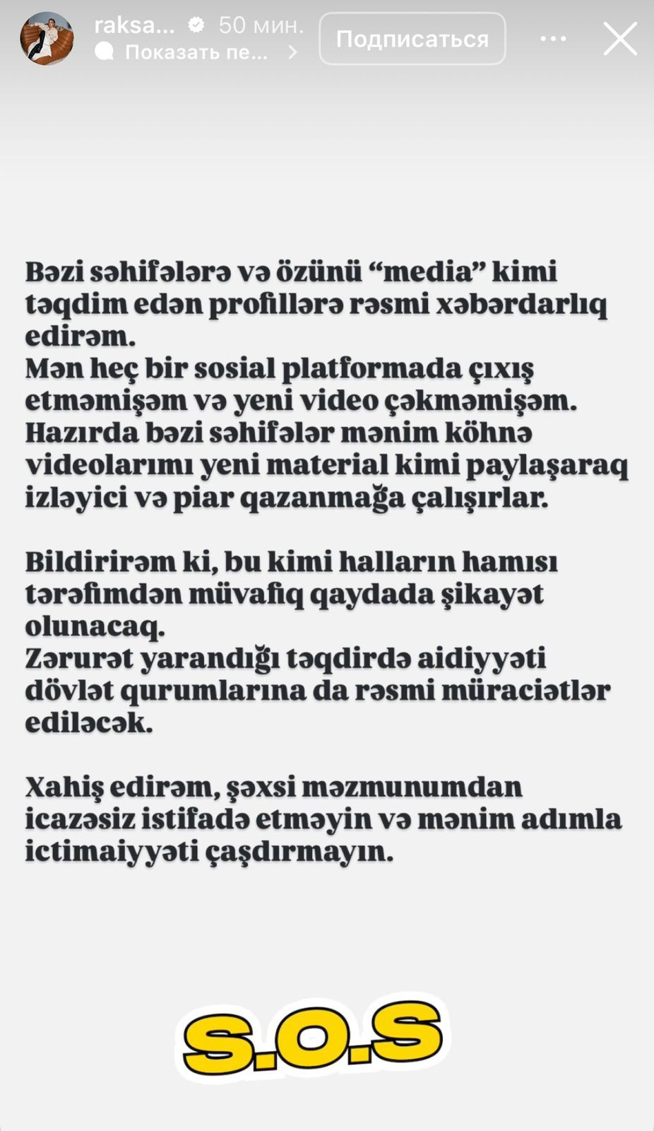 Müğənni Rəqsanə sosial şəbəkə hesabında bəzi səhifələrə və özünü “media” kimi təqdim edən profillərə rəsmi xəbərdarlıq ünvanlayıb.