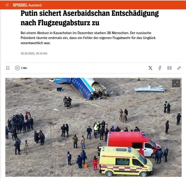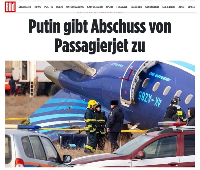 Almaniyanın nüfuzlu media orqanları Rusiya Prezidenti Vladimir Putinin Düşənbədə Azərbaycan Prezidenti İlham Əliyev ilə görüşdə "Azərbaycan Hava Yolları" QSC-nin (AZAL) təyyarəsinin qəzaya uğramasına görə Rusiya hava hücumundan müdafiə qüvvələrinin məsuliyyət daşımasını ilk dəfə etiraf etməsindən yazıb.