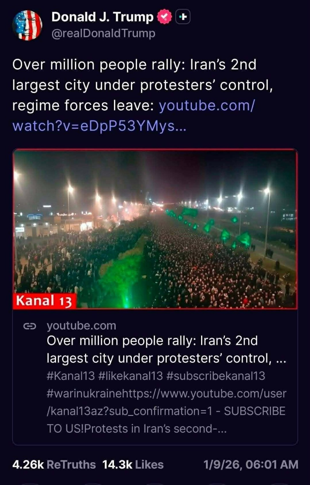 Manset.az xəbər verir ki, ABŞ lideri İranda baş verən son hadisələrlə bağlı Azərbaycanın yutub üzərindən yayımlanan “Kanal13.TV” platformasına istinad edib.