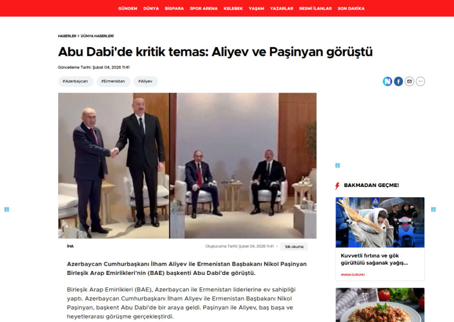Türkiyənin “Hürriyet” qəzetinin dərc etdiyi “Əbu-Dabidə kritik təmas: Əliyev Paşinyan ilə görüşdü” sərlövhəli məqalədə bildirilib ki, tərəflər hər iki cəmiyyətin sülhün faydalarına real həyatda şahid olduqlarını qeyd ediblər. Onlar ikitərəfli ticarətin başlamasından və Azərbaycandan Ermənistana neft məhsullarının ixracının davam etməsindən, həmçinin üçüncü ölkələrdən Ermənistana taxıl və digər malların Azərbaycan ərazisindən tranzitinin həyata keçirilməsindən məmnun olduqlarını bildiriblər. Bakı və İrəvan ikitərəfli ticarət və iqtisadi əməkdaşlığı genişləndirmək üçün imkanları araşdırmağı davam etmək barədə razılığa gəliblər.
