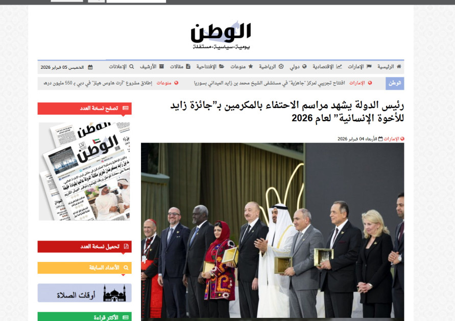 BƏƏ-nin “Al İttihad”, “The Travel Dubai”, “UAE Barq”, “Al Vatan”, “Nabd” qəzet və portalları da Prezident İlham Əliyevə “Zayed İnsan Qardaşlığı Mükafatı”nın təqdim olunması barədə materiallar dərc edib. Qeyd olunub ki, Azərbaycanın dövlət başçısı dinlərarası dialoqun inkişafına verdikləri töhfəyə, həmçinin sivilizasiyaların bir-birinə daha da yaxınlaşması istiqamətində göstərdikləri səylərə görə Əl-Əzhərin böyük imamı, doktor Əhməd Əl-Tayyibə və Roma Papası, Zati-müqəddəsləri Leoya dərin minnətdarlığını bildirib, həmçinin mərasimə ünvanladıqları xoş müraciətlərində bir daha Azərbaycan və Ermənistan arasında sülhün əhəmiyyətini vurğulayan bütün həmkarlarına təşəkkür edib. Dövlətimizin başçısının sözləri də sitat gətirilib: “Bu sülh təkcə iki ölkə üçün deyil, daha geniş region üçün də böyük əhəmiyyət kəsb edir. Biz 30 ildən artıq müddətdə müharibə şəraitində olmuşuq. İndi isə artıq altı aydır ki, sülh şəraitində yaşayırıq”.
