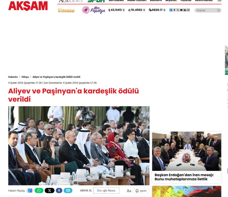 Qardaş ölkənin “İhlas” xəbər agentliyinin və “Haber Global” telekanalının saytında, həmçinin “Akşam”, “Yeni Akit”, “Birgün” qəzetlərində, “Haber365”, “Haberlerim”, “Son dakikam”, “Haber sitesi” və geniş auditoriyaya malik digər portallarda Prezident İlham Əliyevə “Zayed İnsan Qardaşlığı Mükafatı”nın təqdim olunması, həmçinin onun Ermənistanın Baş naziri ilə keçirdiyi görüş barədə materiallar dərc olunub.