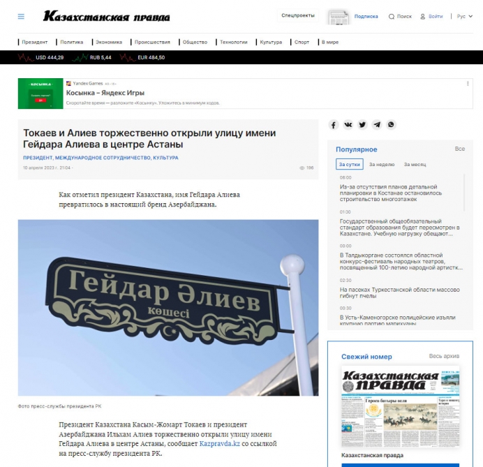 Bir çox media orqanları Azərbaycan Prezidenti İlham Əliyev və Qazaxıstan Prezidenti Kasım-Jomart Tokayevin iştirakı ilə aprelin 10-da Astananın mərkəzində Heydər Əliyev küçəsinin təntənəli açılışından bəhs ediblər. “inAstana” xəbər saytı və digər kütləvi informasiya vasitələri yazıblar ki, bu əlamətdar hadisə Azərbaycan xalqının böyük oğluna ehtiramın daha bir örnəyidir.