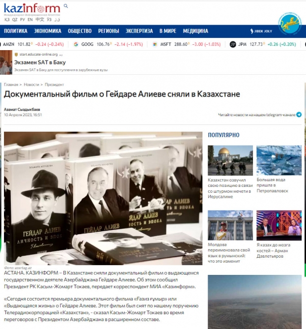 “Kazinform” agentliyi Azərbaycanın görkəmli dövlət xadimi Heydər Əliyevə həsr olunmuş sənədli filmin premyerasından yazıb. Məqalədə qeyd edilib ki, Kasım-Jomart Tokayev geniş heyətdə danışıqlar zamanı filmin premyerası barədə Azərbaycan Prezidenti İlham Əliyevə məlumat verib. O qeyd edib ki, bu gün Qazaxıstan Prezidentinin göstərişi ilə “Qazaxıstan” teleradio korporasiyası tərəfindən lentə alınmış Heydər Əliyev haqqında “Görkəmli həyat” sənədli filminin premyerası olacaq.