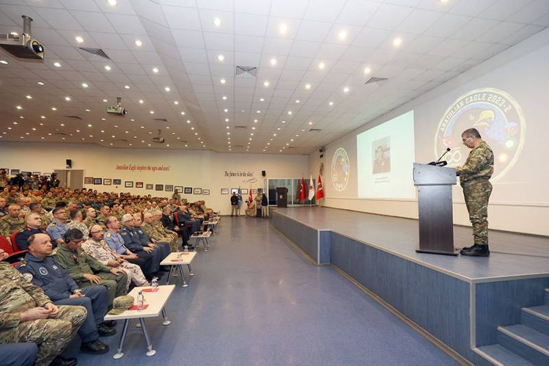 Brifinq zalında qonaqlara “Anadolu Qartalı – 2023” taktiki-uçuş təlimində çəkilmiş görüntülər əsasında hazırlanan videoçarx təqdim olunub.