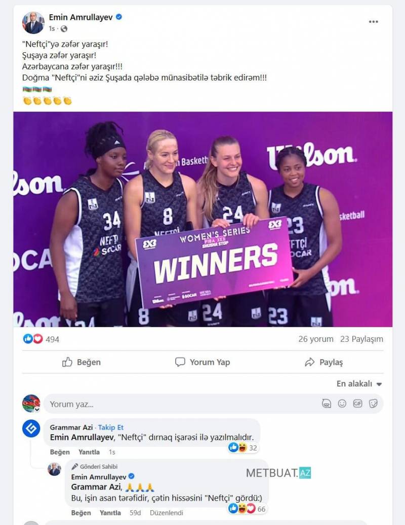 Sözügedən səhifə elm və təhsil nazirinin paylaşımına ““Neftçi” dırnaqda yazılmalıdır” deyə irad bildirib. Emin Əmrullayev isə həmin rəyə “bu, işin asan tərəfidir, çətin hissəsini “Neftçi” gördü”” cavabını yazıb.