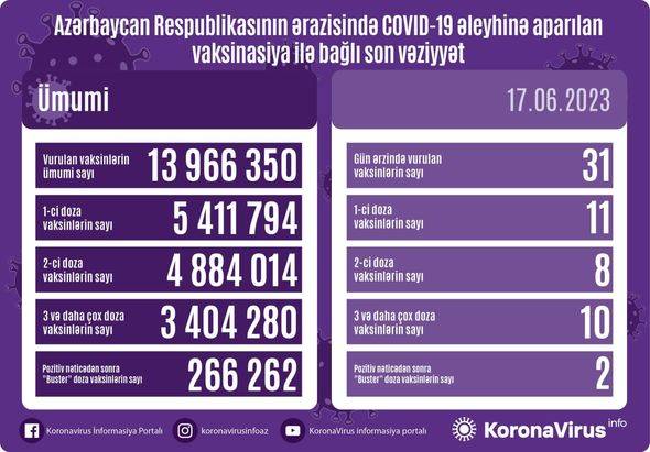 Vurulan vaksinlərin ümumi sayı 13 966 350, birinci mərhələ üzrə vaksinasiya olunanların ümumi sayı 5 411 794, ikinci mərhələ üzrə vaksinasiya olunanların sayı 4 884 014, üç və daha çox doza üzrə vaksinasiya olunanların sayı 3 404 280, pozitiv nəticədən sonra buster doza üzrə vaksinasiya olunanların sayı isə 266 262 nəfər təşkil edir.